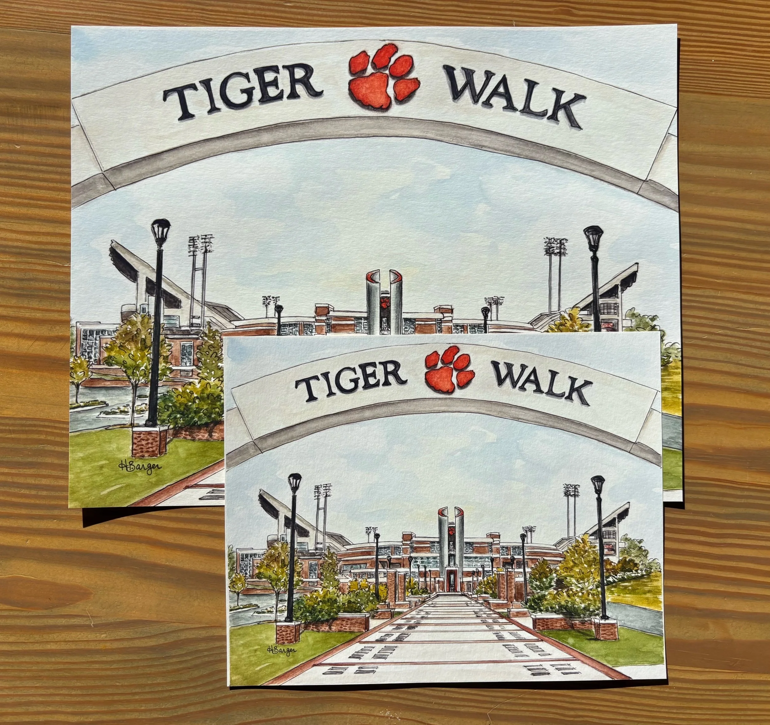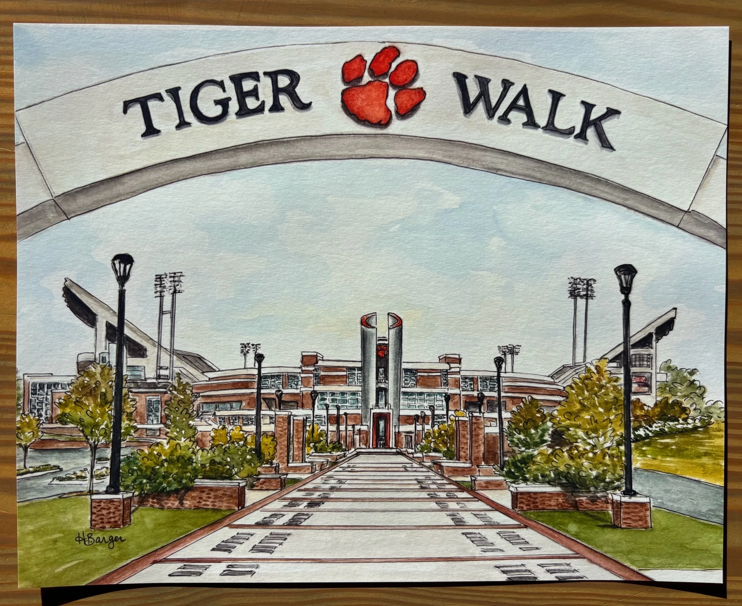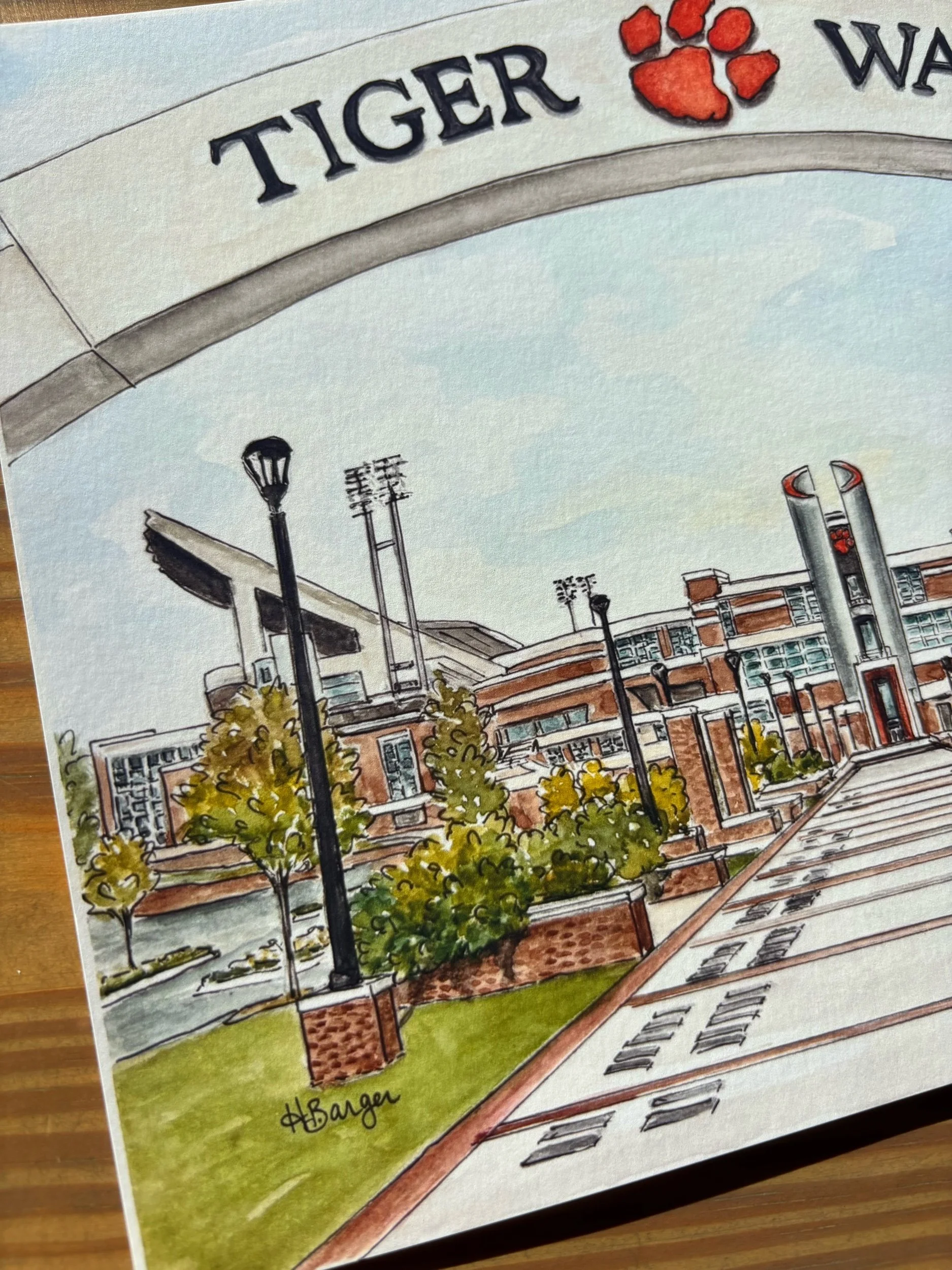 The grand entrance of Clemson University's football stadium is showcased with the famed "Tiger Walk". A decorated path leading to Clemson's iconic Death Valley in South Carolina. This giclée art print is a professional reproduction of my original watercolor painting. Printed on archival quality, fine art textured paper, these prints make wonderful gifts for graduation, weddings, housewarmings or any special occasion.