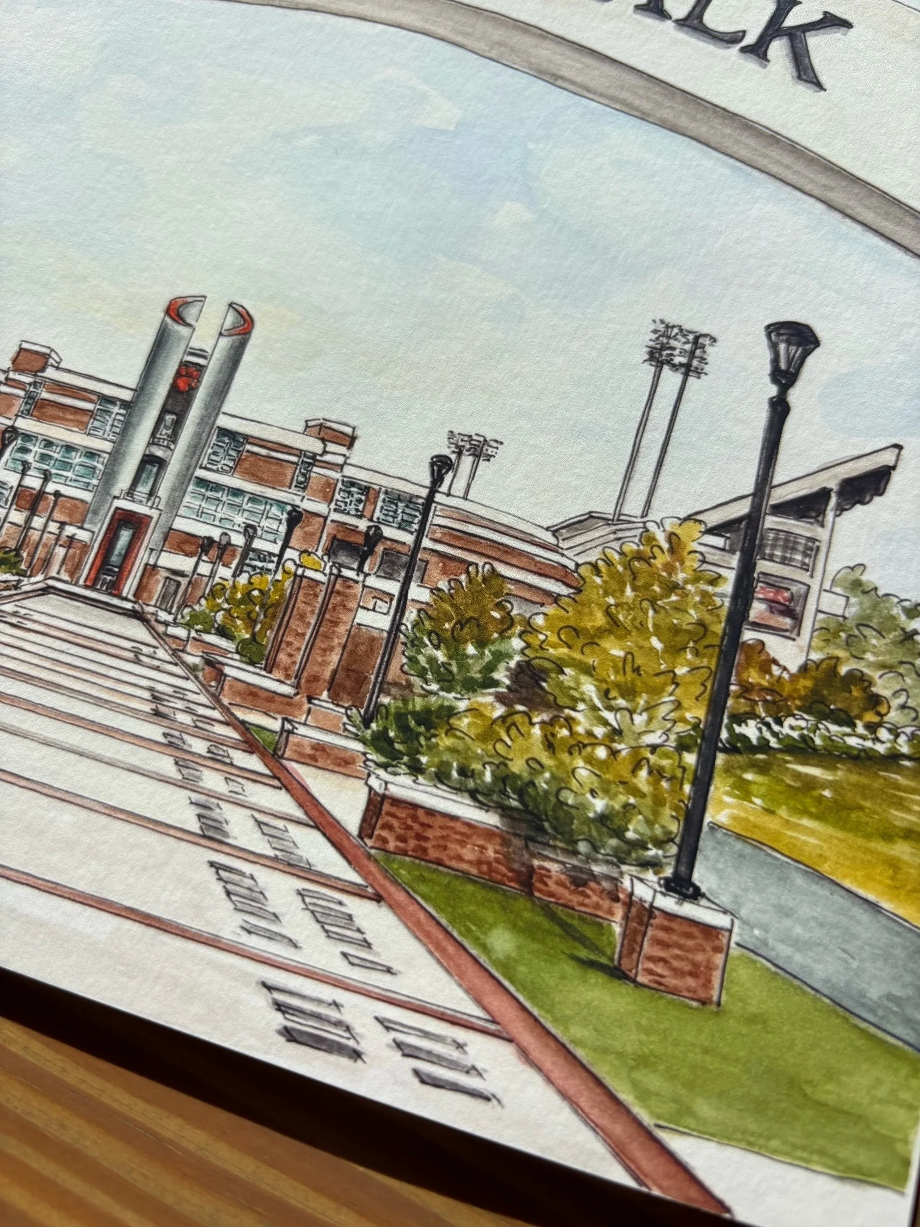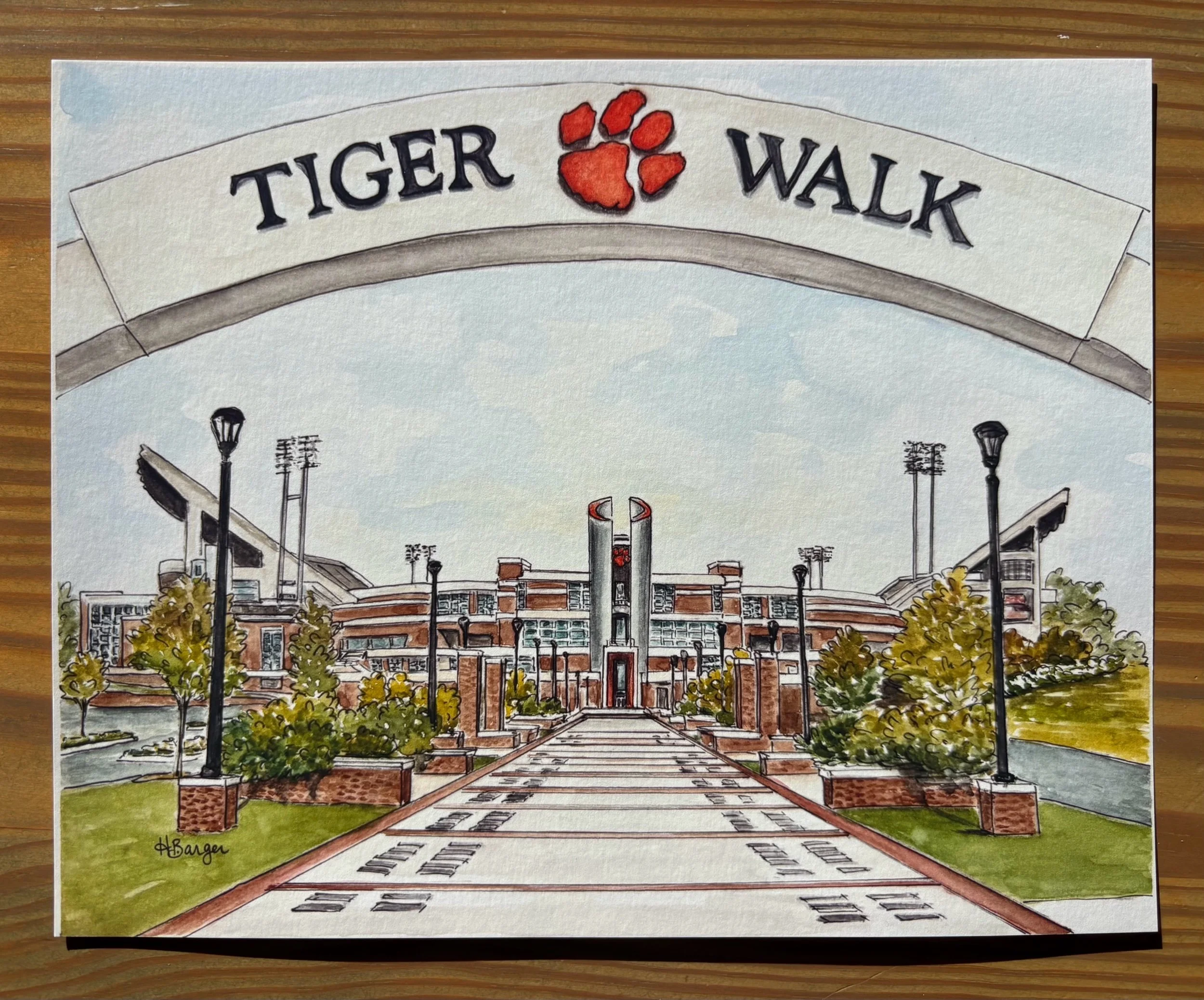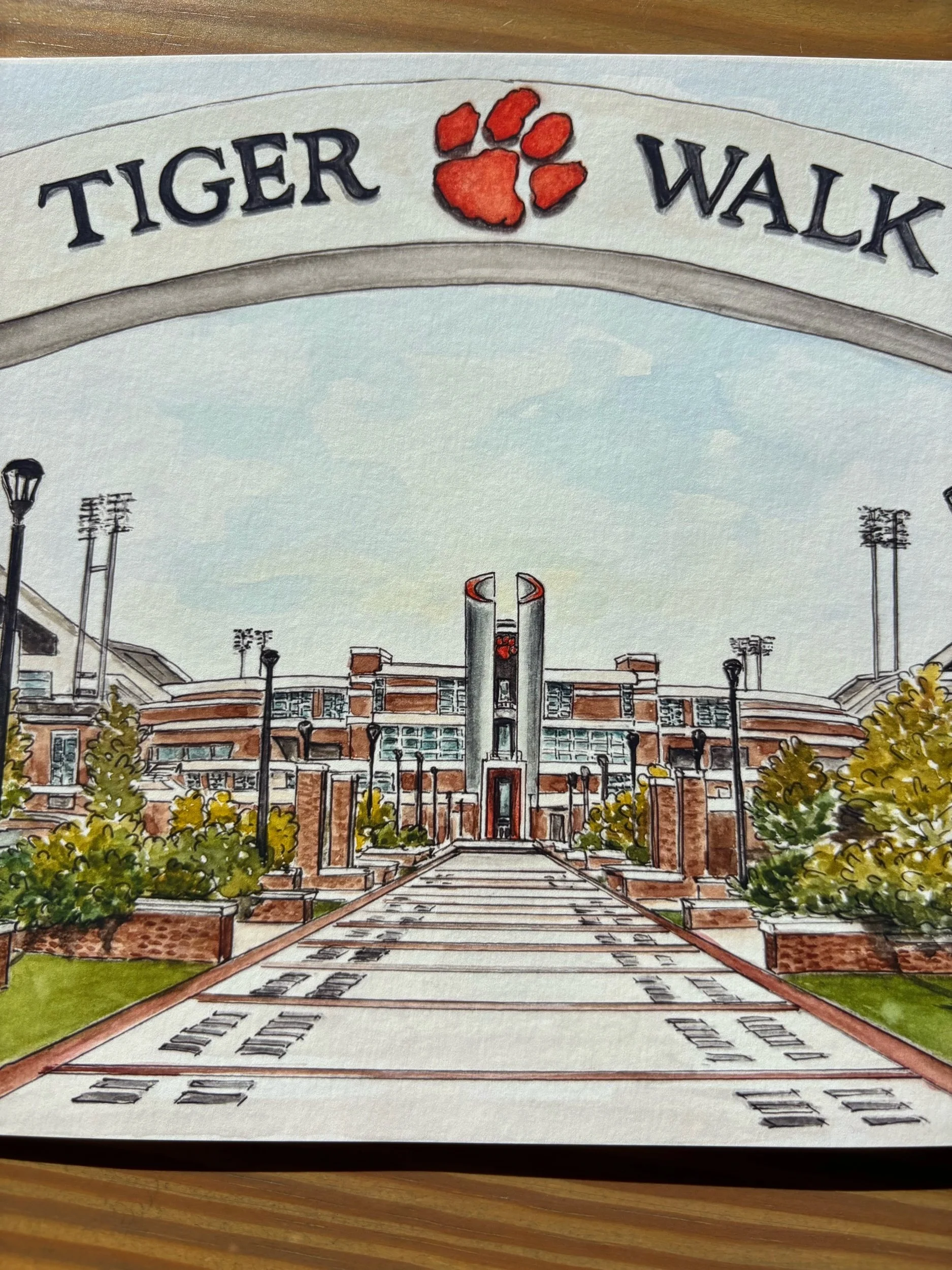 The grand entrance of Clemson University's football stadium is showcased with the famed "Tiger Walk". A decorated path leading to Clemson's iconic Death Valley in South Carolina. This giclée art print is a professional reproduction of my original watercolor painting. Printed on archival quality, fine art textured paper, these prints make wonderful gifts for graduation, weddings, housewarmings or any special occasion.
