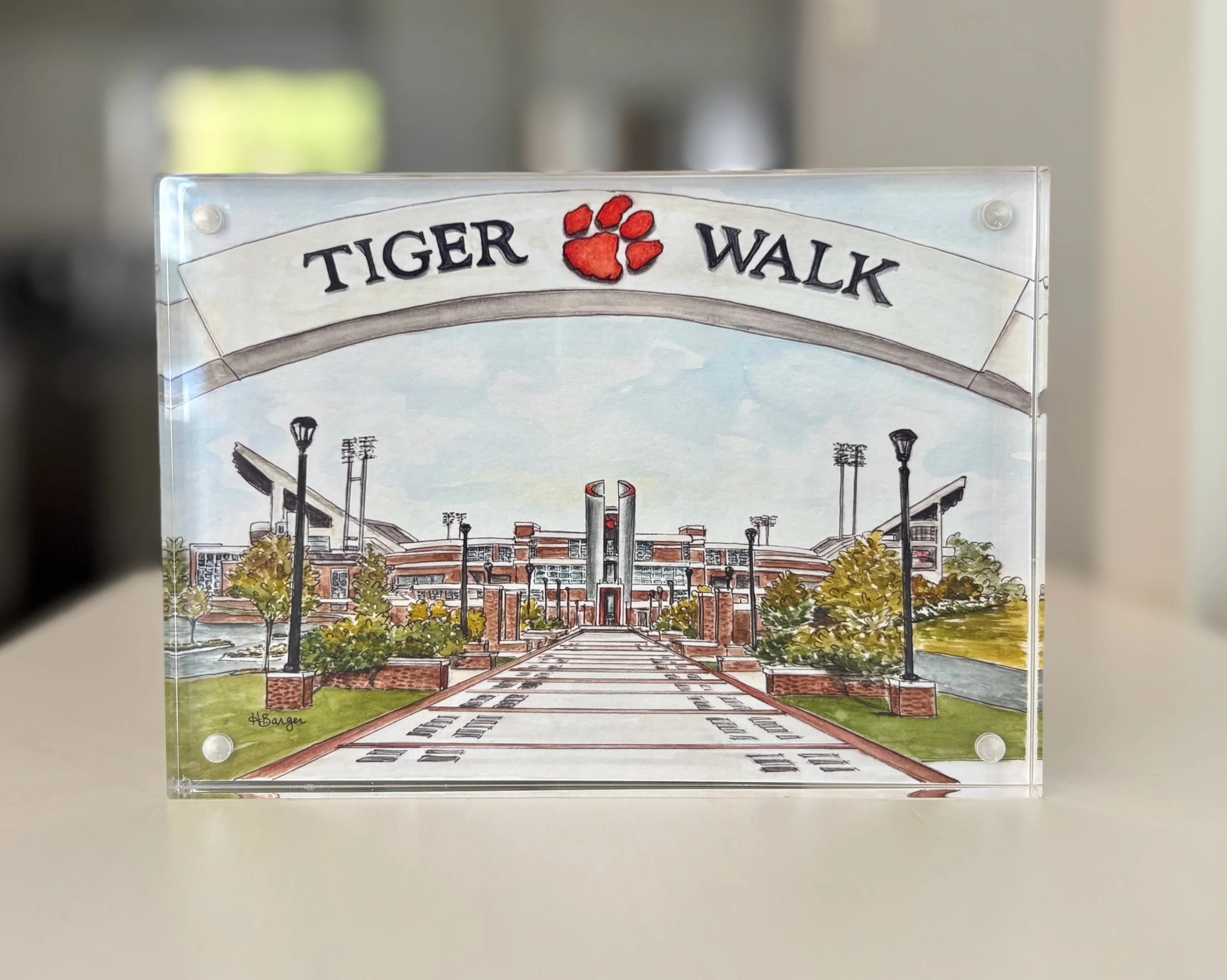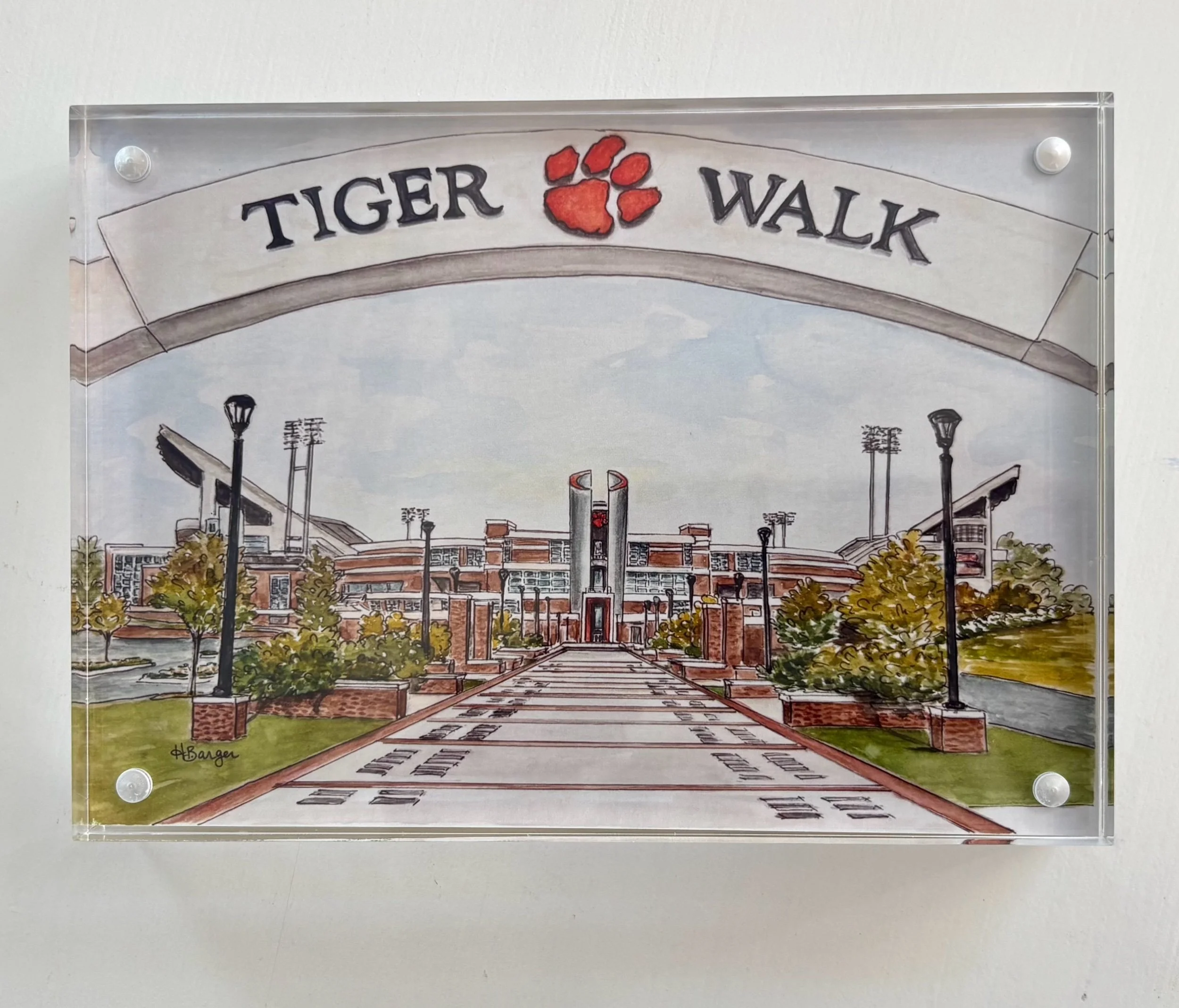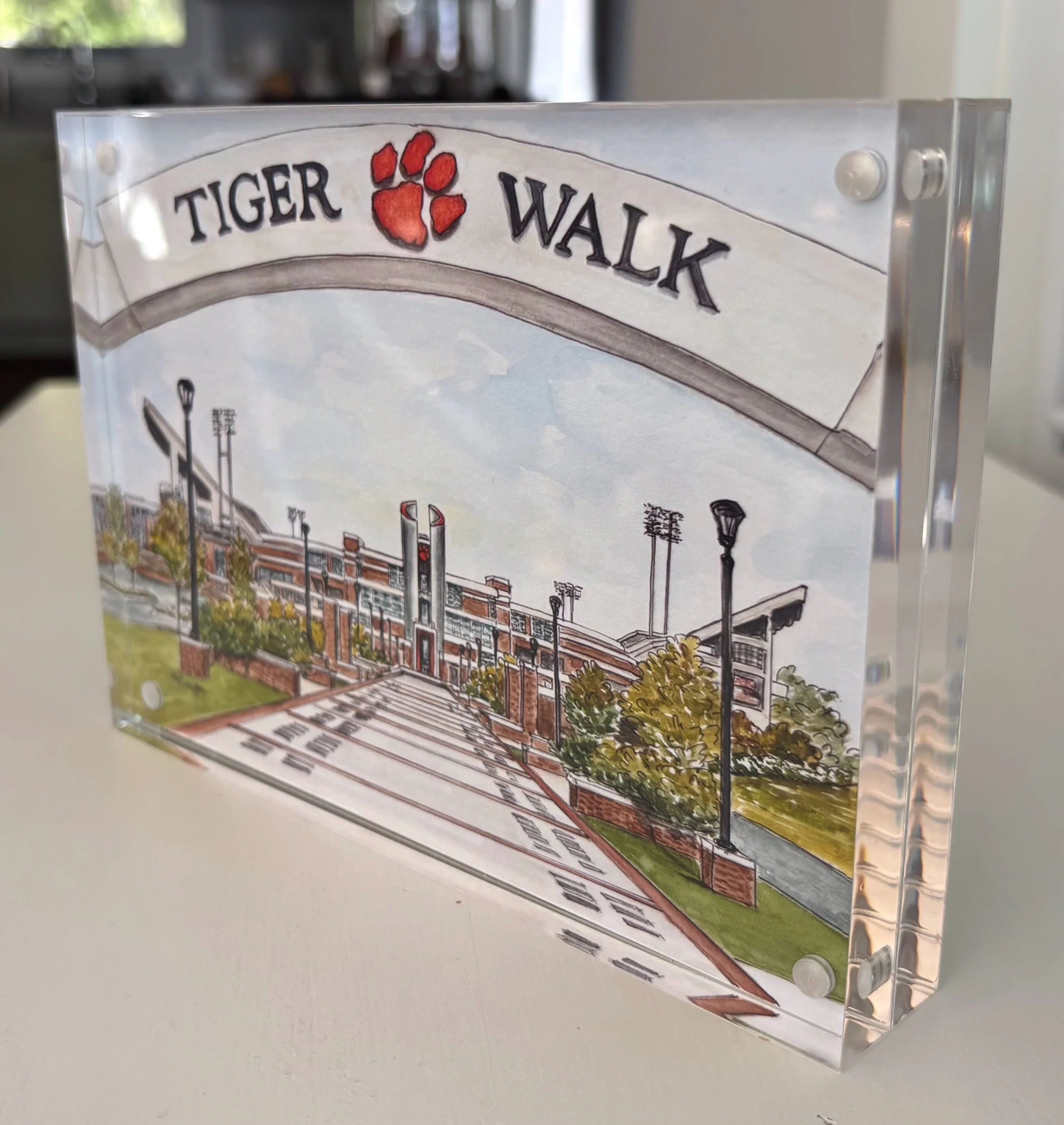 The grand entrance of Clemson University's football stadium is showcased with the famed "Tiger Walk". A decorated path leading to Clemson's iconic Death Valley in South Carolina. This giclee art print is a professional reproduction of my original watercolor painting. Printed on archival quality paper, the included art print is framed in an acrylic, magnetic frame that is ready for display. These framed prints make wonderful gifts for graduation, weddings, housewarmings and more.