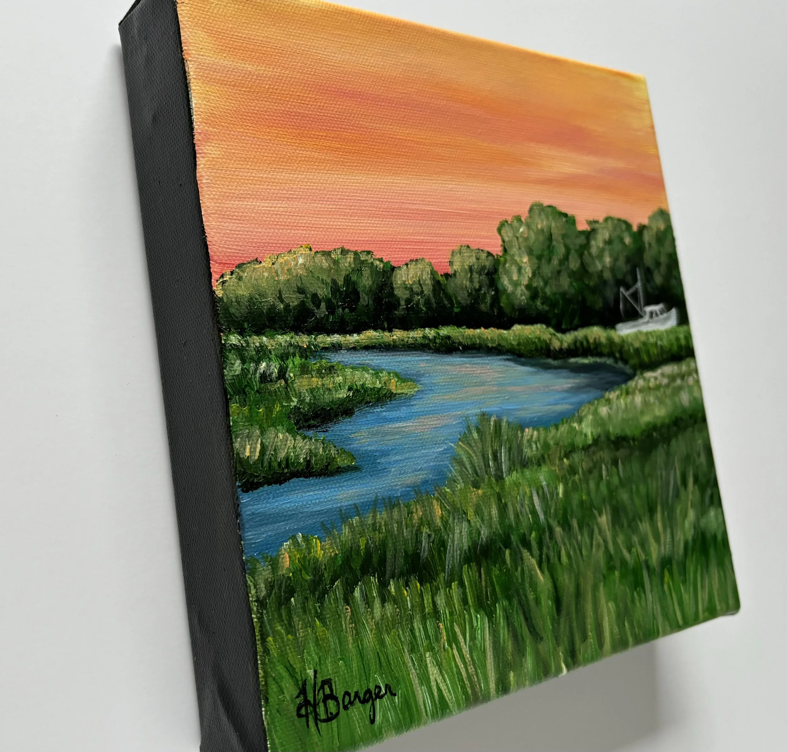 This is an original acrylic painting on canvas of a colorful marsh and shrimp boat, located in the low country of South Carolina. Warm skies, brilliant water and a retired shrimp boat remind us of where we're going and where we've been. This square 8"x8" canvas makes a colorful accent piece for any home decor.